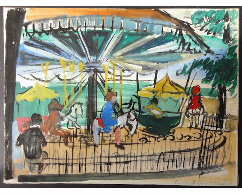 "Paris" (Karussell), 1957, schöne, farblich verspielte Zeichnung des Karusells im Pariser Luxembourg